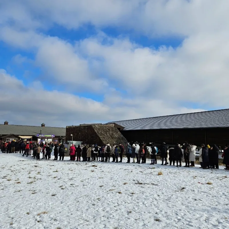 이제 종이 탑승권을 들고 곤도라 탑승장으로 향하는데요. 듣던 대로 곤도라 대기 줄이 어마합니다. 설원을 누비는 스키어들 사이로 곤도라 탑승을 기다리는 관광객들이 이색적인 풍경을 연출하는데요. 잠시 후 주차를 마치고 돌아온 남편이 줄을 서는 사이 저는 아이젠을 대여하기 위해 스키용품점으로 갑니다.