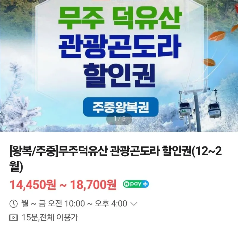 덕유산 관광곤돌라 왕복요금은 성인 2만 2천 원, 소인 1만 7천 원으로 네이버 예매 시 주말은 10%, 주중은 15% 할인가에 예매할 수 있습니다.