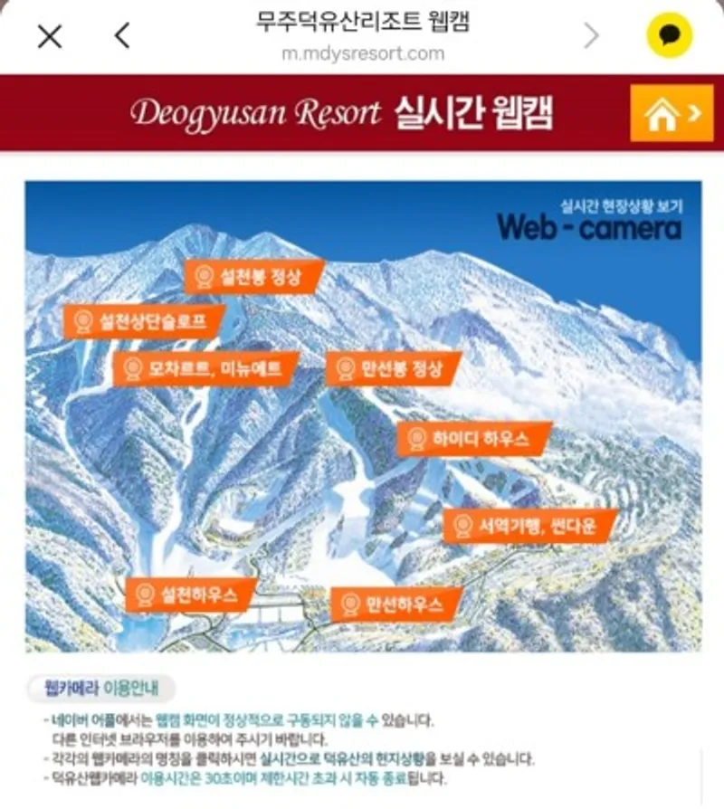 또 하나 덕유산 설경 감상을 목적으로 방문하기 전 현장의 기상 상황을 확인하는 것도 중요한데요. 위에 안내된 사전 예약 페이지를 통해 현장에서 실시간 웹캠으로 촬영 중인 모습을 확인할 수 있어 좋았어요.