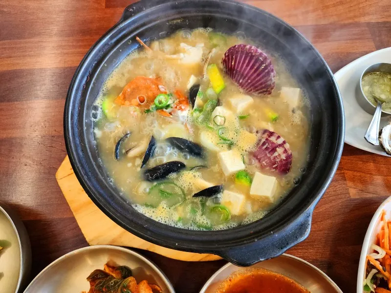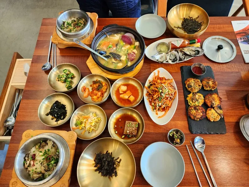 굴 돌솥밥, 생굴, 굴전, 굴 회 무침, 해물 가득 들어간 된장국이 푸짐합니다.