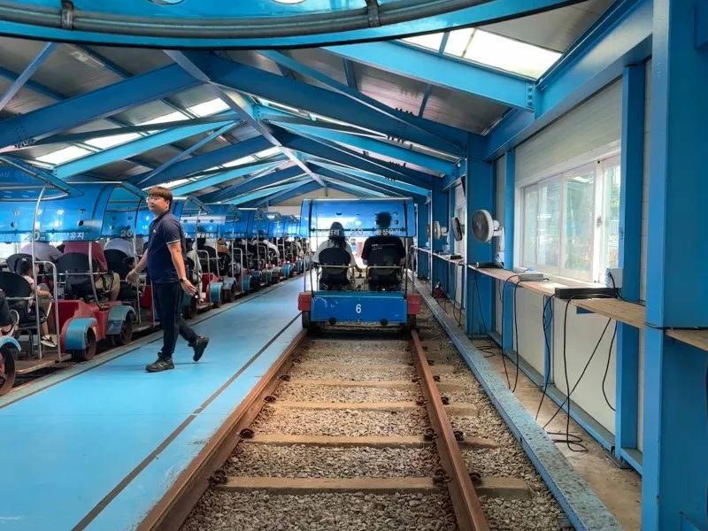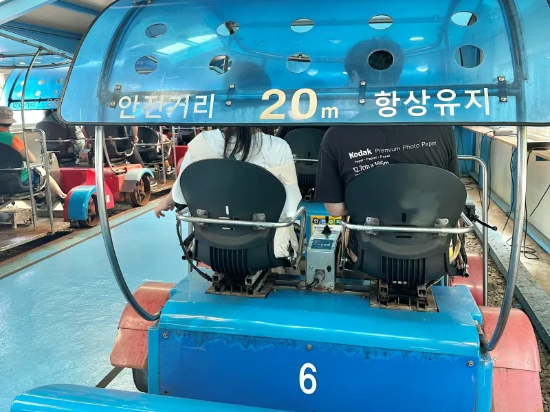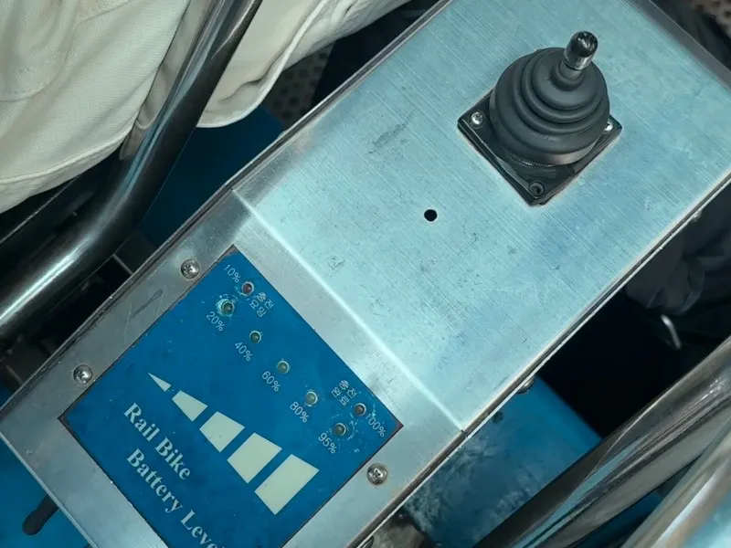 운행 방식이 전동식이라 자전거 페달을 돌리지 않아도 자동으로 갑니다. 그렇기 때문에 정말 편안하게 주변 바다 경치를 즐기며 레일바이크를 탈 수 있었습니다. 아주 어린아이나 노약자 분들도 무리 없이 탈 수 있고요! 오르막길 정도에만 살짝 페달을 밟고, 앞차와의 간격 유지를 위해 수동으로 브레이크를 잡아 간격을 조정하시면 됩니다.