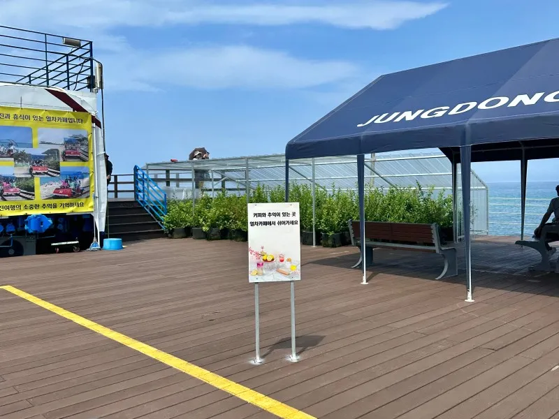 중간 반환점에는 열차 카페에서 쉴 수 있는 시간이 주어져, 잠시 나가 의자에 앉아 파도치는 바다 풍경을 바라보기도 했습니다. 참고로 열차 카페에서는 구슬 아이스크림 등의 간식거리를 사 먹을 수 있고 레일에 위치한 세 곳의 포토존에서 찍힌 사진을 보고 구매를 할 수도 있었습니다.
