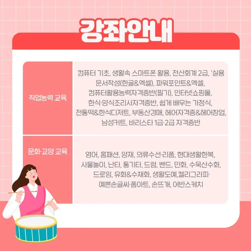 영어, 홈패션, 양재, 의료수선·리폼, 현대생활한복, 사물놀이, 난타 , 통기타, 드럼, 밴드, 민화, 수묵산수화, 드로잉, 유화&수채화, 생활도예 , 켈리그라피·예쁜손글씨·폼아트, 손뜨개, 어반스케치 |