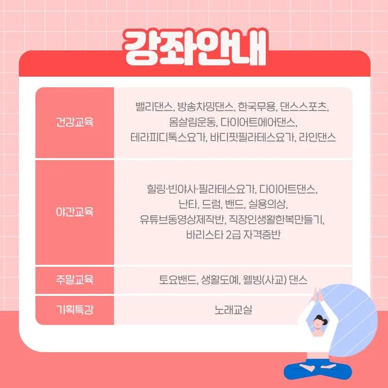 힐링 · 빈야사 · 필라테스요가, 다이어트댄스 , 난타, 드럼, 밴드, 실용의상 , 유튜브동영상제작반, 직장인생활한복만들기, 바리스타 2급 자격증반 |
