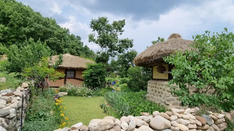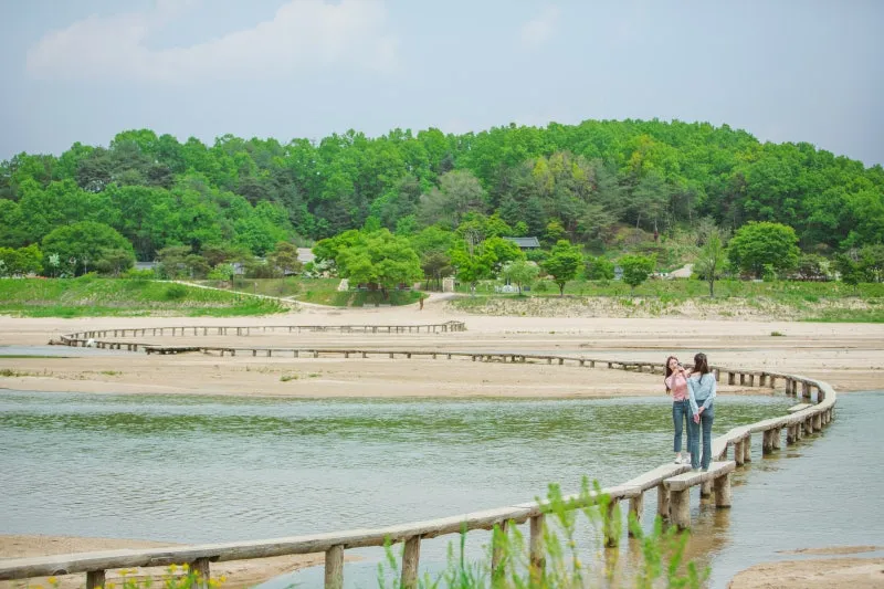 전통 한옥마을과 외나무다리를 흐르는