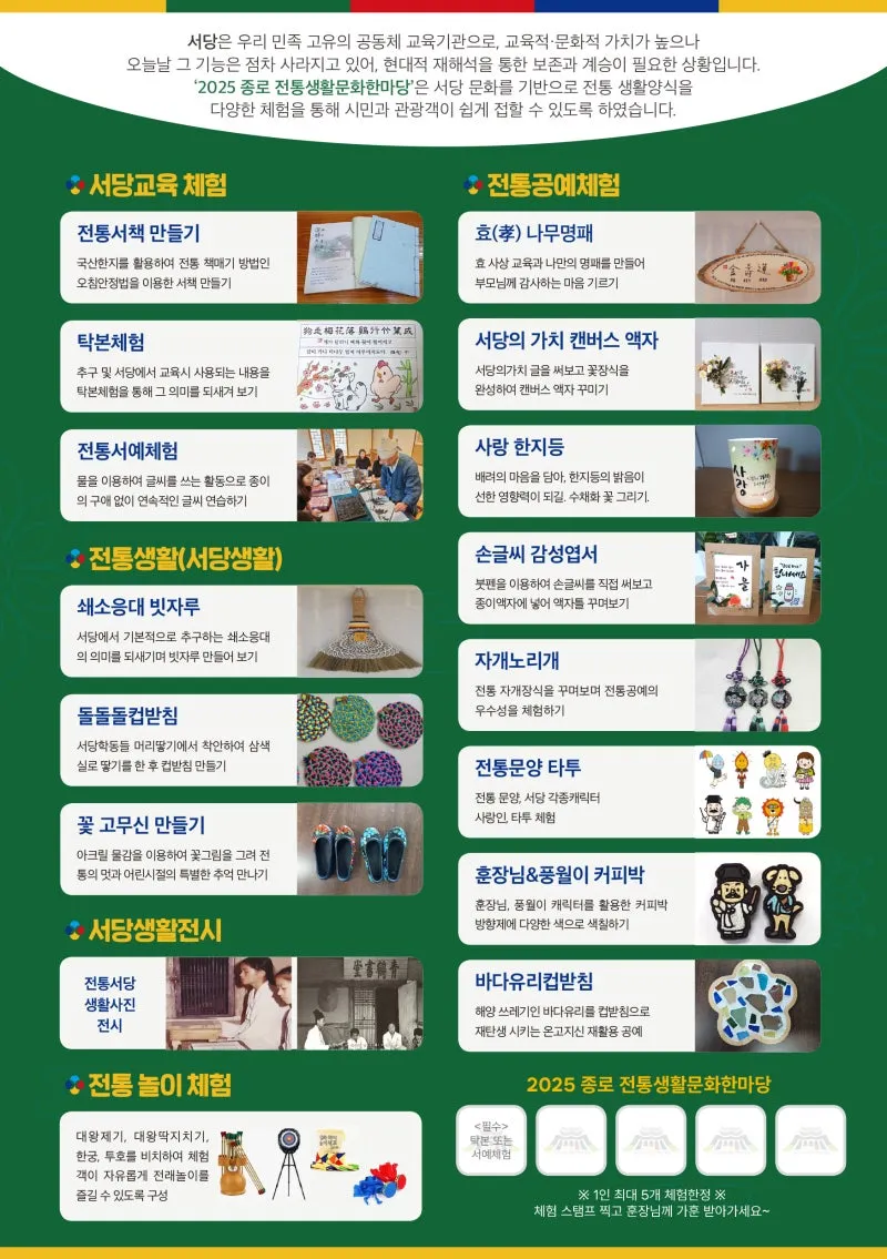 서당교육, 전통생활, 전통공예, 전래놀이 체험 등