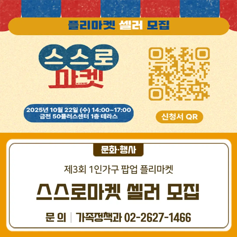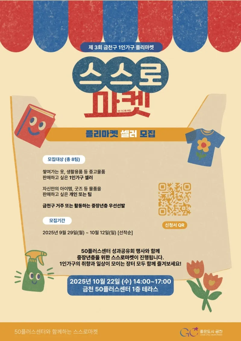 금천구 거주·생활하는 1인가구 주민과 커뮤니티가 함께하는 생활문화 장터, 스스로마켓이 10월 22일(수) 금천50플러스센터에서 열립니다. 이번 회차는 「50플러스 성과공유회」와 함께 진행되며, 중장년 1인가구와 커뮤니티의 참여를 우선 선발합니다. 중고 거래, 수제품·굿즈 판매 등 다양한 방식으로 함께하실 셀러를 모집합니다. 나의 이야기를 담은 물건과 경험을 나누고 싶은 분들의 많은 참여를 기다립니다. 🌿 행사 일시: 2025년 10월 22일(수) 14:00~17:00 장소: 금천50플러스센터 1층 테라스 모집 기간: 2025년 9...