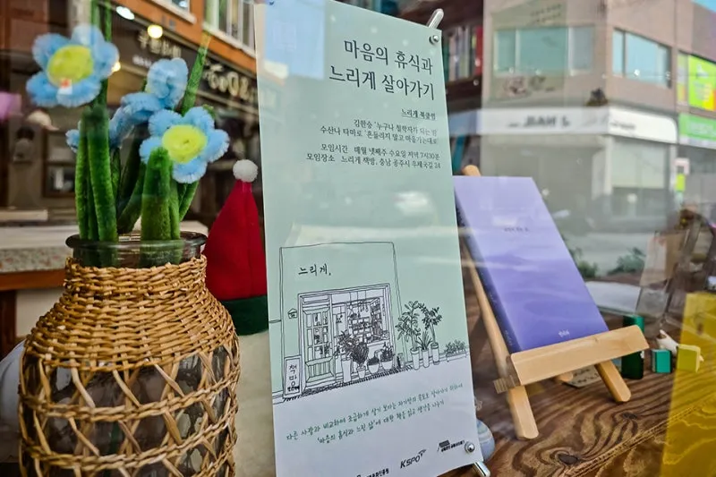 첫 번째 소개해 드릴 곳은 느리게,책방입니다. 중동 먹자골목과 제민천 주변에 자리하고 있어 원도심 여행을 즐기러 오는 사람들에게도 가볍게 들러볼 수 있는 작은 휴식공간인데요, 바쁘게 살아가는 삶에서 느리게라는 말 자체도 왠지 포근하게 느껴집니다.