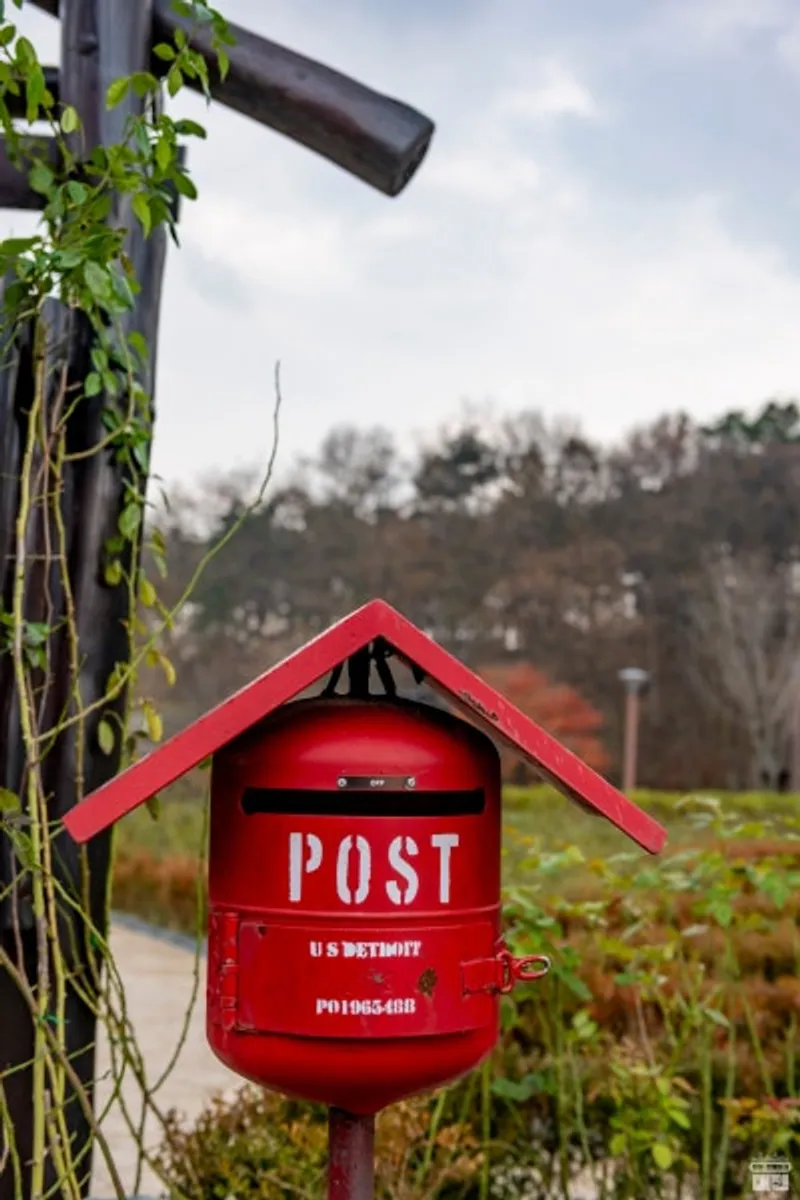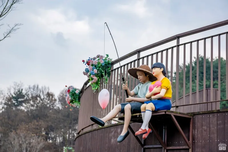 산책길을 따라 걷다 보면 ‘사랑을 낚는 연인’이라는 구조물이 나타납니다. 낚싯대를 들고 하트를 낚은 남성과 하트를 품은 여성의 모습은 재미있으면서도 로맨틱한 상징이었습니다. 그 옆에는 빨간색이 돋보이는 독특한 모양의 우체통이 자리 잡고 있어, 이곳의 낭만적인 분위기를 한층 더해주었습니다.