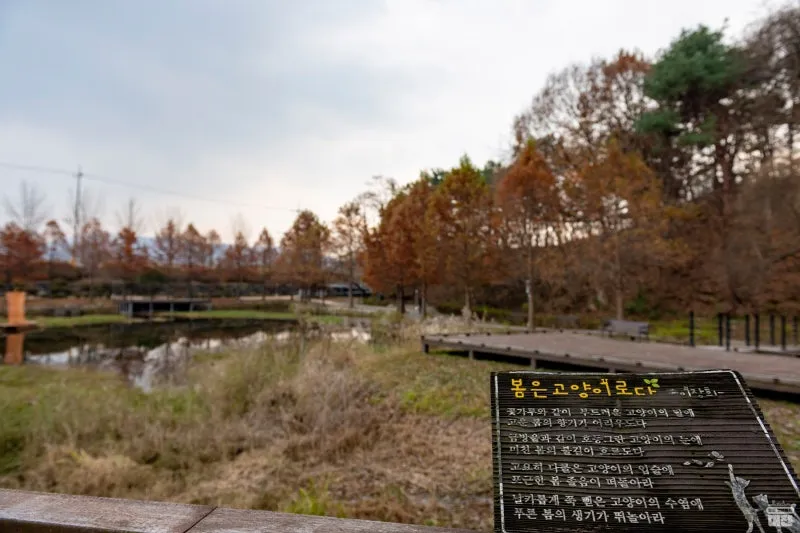 수변공원을 따라 걷다 보면 눈길을 사로잡는 장소들이 많습니다. 그중 하나는 ‘봄은 고양이로다’라는 시구가 적힌 곳입니다. 시구 아래로 펼쳐진 저수지와 가을 풍경은 깊은 감성을 불러일으키기에 충분했습니다. 이곳에서 시간을 잠시 멈추고, 가을의 여운을 사진 속에 담았습니다.