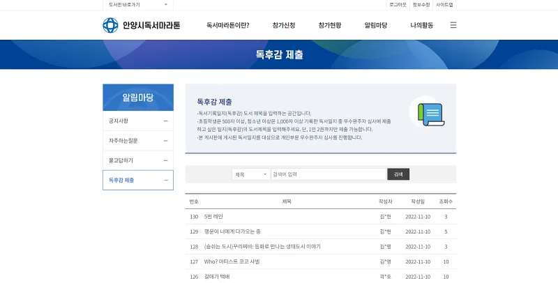 독서마라톤 홈페이지 ‘독후감 제출’ 게시판에 심사 대상 도서명(2권) 입력 *단, 1인 2작품까지만 제출 가능 |