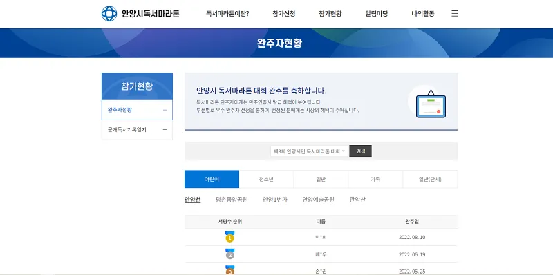 초등학생 이상 참가자 중 완주자(단, 안양시민에 한함. 7세 이하는 완주만 인정) |