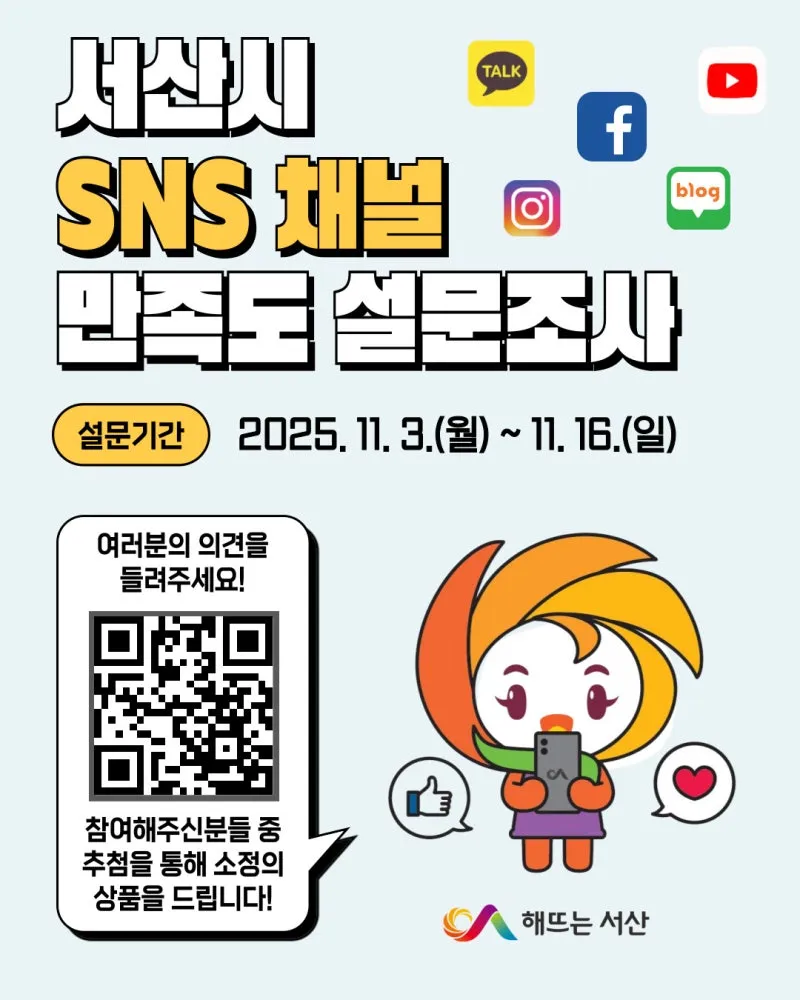 「서산시 SNS 채널 만족도 설문조사」를 실시합니다!
