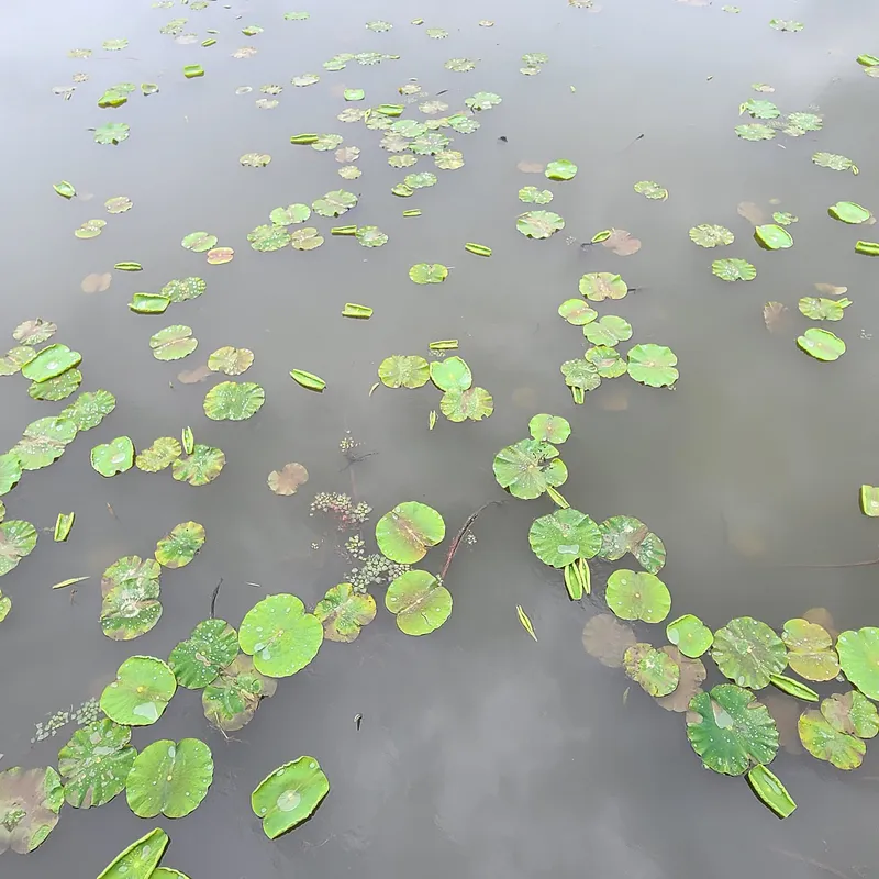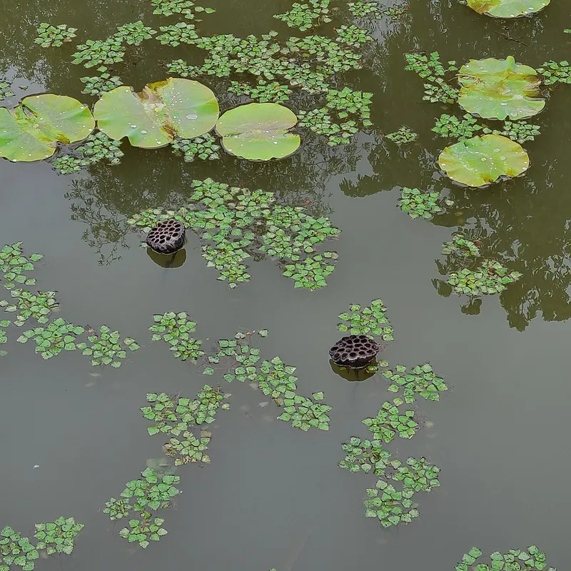 꽃이 지고 남겨진 빈 연밥도 물위를 둥둥 떠다니는곳에, 수생식물인 마름도 잎을 피웠습니다.