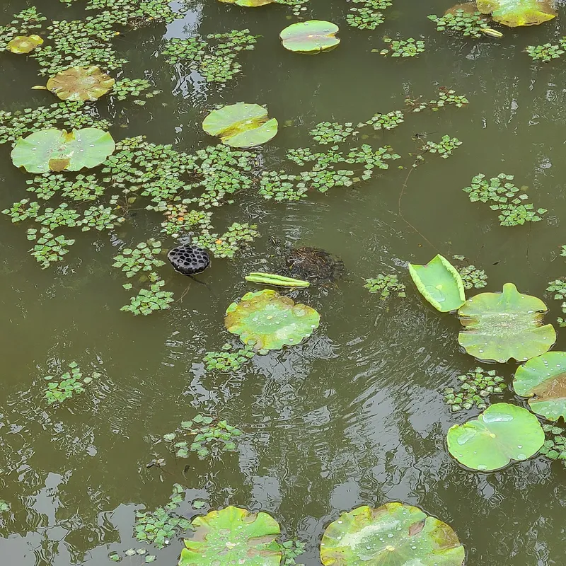 연잎을 보다가 물에서 소리가 들려 보니까 자라가 여러마리 있었어요.