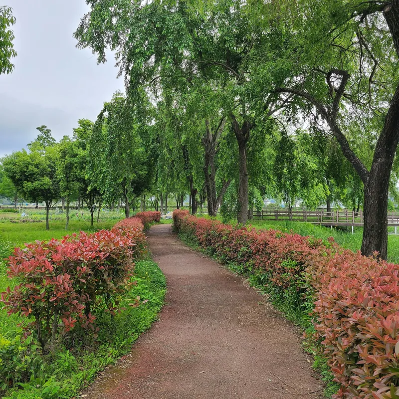 낙우송길을 벗어나면 홍가시나무길이 나오는데 초록과 붉은색의 조화도 보기 좋습니다.