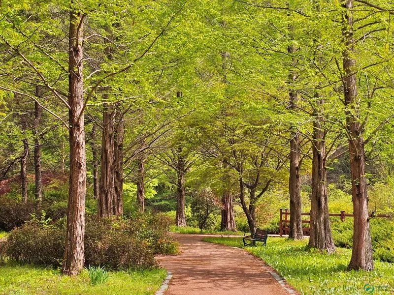 한적하고 파란 하늘에 코 끝에 닿는 공기가 맑습니다. 쭉쭉 뻗어 있는 메타세콰이어나무에도 연두빛이 짙어져가는 예쁜 산책로에는 벤치가 놓여있어 풍경화 속 같습니다.