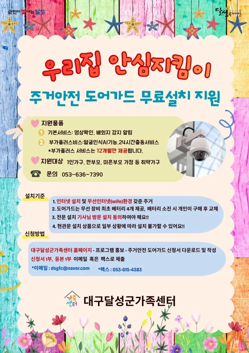 대구달성군가족센터에서 1인 가구 등의 주거안전을 위한 도어가드 장비 무료 설치를 지원합니다!