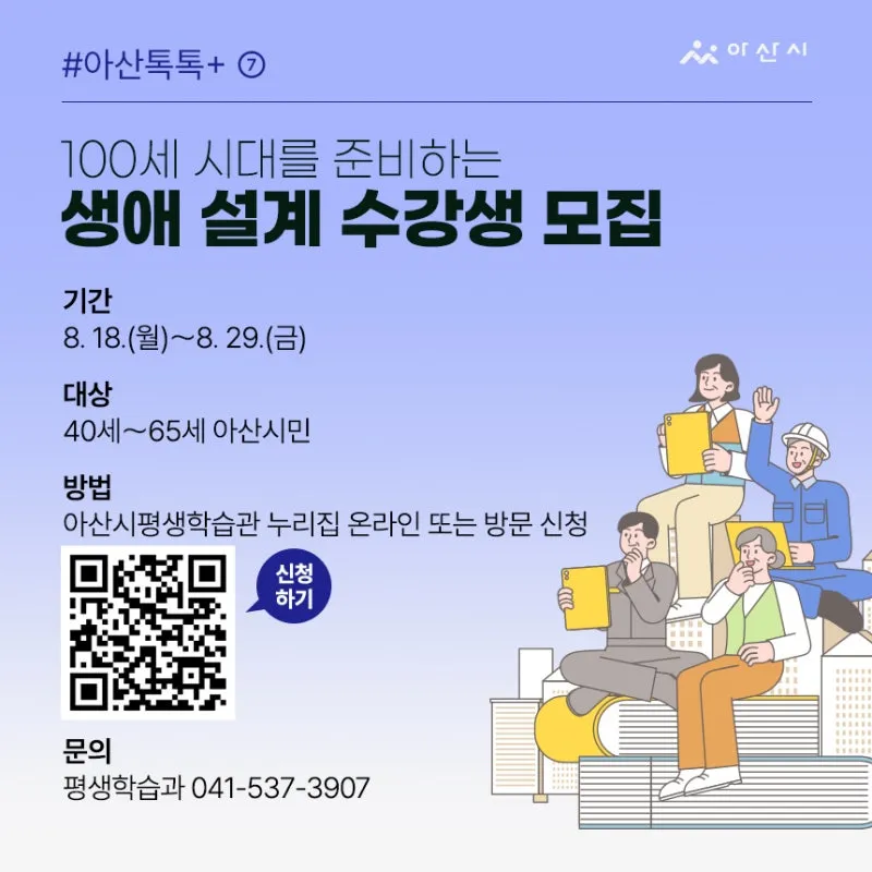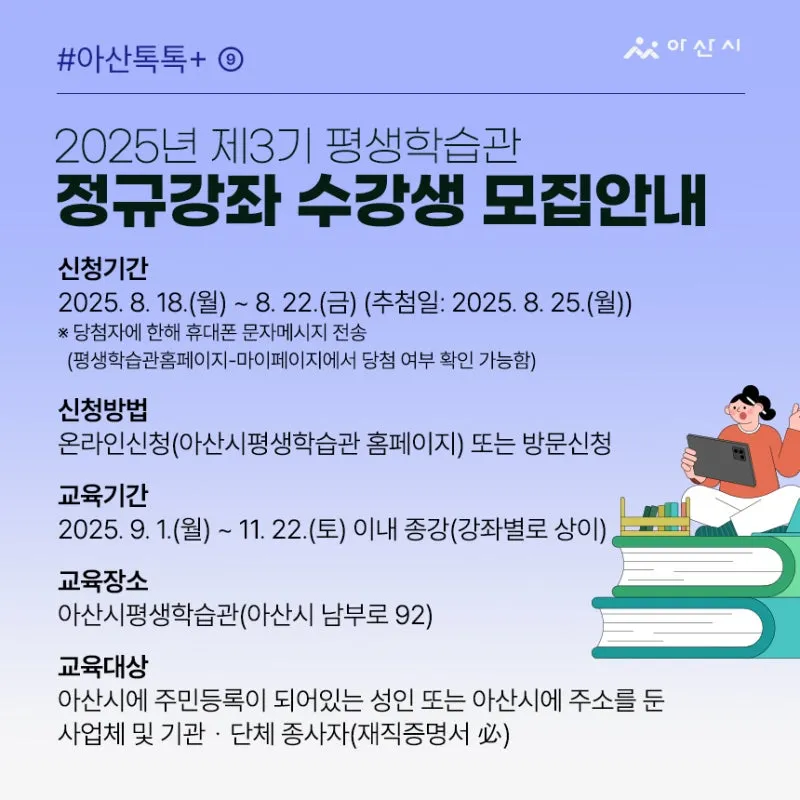 방법: 아산시평생학습관 누리집(life.asan.go.kr) 온라인 또는 방문 신청
