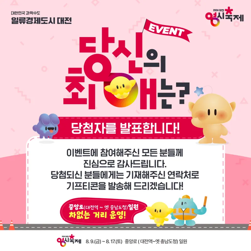 대전 0시 축제에서 가장 기대되는 프로그램을 고르는 '당신의 최애는?' 이벤트에 참여해주신 모든 분들께 감사드립니다🥳 당첨자는 아래 링크를 통해 확인 가능하며 경품은 7일 이내 발송됩니다.