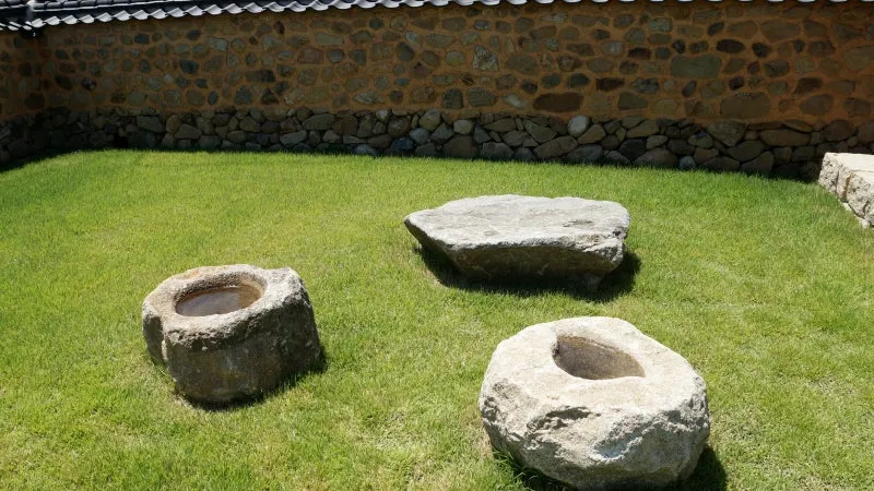 마당 한켠에는 평평한 돌판과 돌절구가 있었고, 반대쪽으로는 기장읍성 동벽이 남아있습니다.