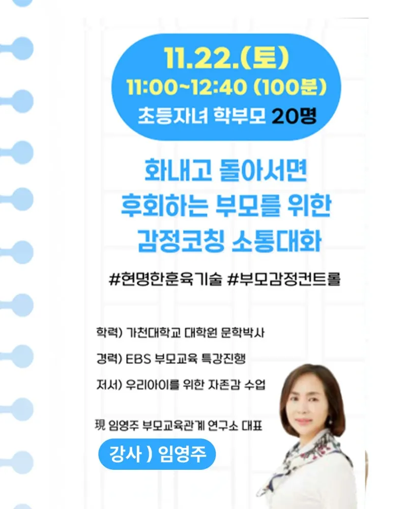 안녕하세요. 용산글로벌교육지원센터 입니다. 학부모 진로-진학 아카데미 <청소년 학부모 명사특강 > 참여자를 모집합니다. 용산글로벌교육지원센터에서 용산구 내 초·중·고등학생 자녀를 둔 학부모 대상으로 올바른 훈육법, 발달단계별 사춘기 자녀이해, 감정코칭 등의 주제를 가지고 부모교육을 진행하고자합니다. [특강일정 및 내용] - 별도 안내 예정 ① 초등자녀 부모교육 - 임영주 강사 1) 일자: 11/22(토) 11:00~12:40(약 100분 강의) 2) 대상: 용산구 거주 또는 관내 초등학생 자녀를 둔 학부모 20명 3) 내용: #현명...