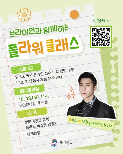 가수 브라이언과 함께하는 정원박람회 플라워클래스❗ 💚접수 기간 2025년 09월 24일(수) ~ 09월 30일(화) 온라인 사전예약 이후 랜덤 추첨 💚접수 방법 구글폼 작성하기 💚모집 대상 및 규모 정원을 사랑하는 누구나, 30명 💚참가비 무료 💚예약 확정 안내 2025년 10월 02일(목) 개별 안내 예정 📌참여 주의사항 - 예약 확정 안내를 위한 최소한의 개인정보(성명, 휴대전화번호 등)를 수집합니다. - 잘못된 정보 입력으로 인한 오발송에 대해서는 재발송·재지급이 불가합니다. - 수집한 개인정보는 예약 확정 안내에만...