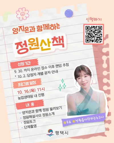 인생 정원을 거닐며 가수 양지은과 이야기 나눠요❗ 💚접수 기간 2025년 09월 24일(수) ~ 09월 30일(화) 온라인 사전예약 이후 랜덤 추첨 💚접수 방법 구글폼 작성하기 💚모집 대상 및 규모 정원을 사랑하는 누구나, 30명 💚참가비 무료 💚예약 확정 안내 2025년 10월 02일(목) 개별 안내 예정 📌참여 주의사항 - 예약 확정 안내를 위한 최소한의 개인정보(성명, 휴대전화번호 등)를 수집합니다. - 잘못된 정보 입력으로 인한 오발송에 대해서는 재발송·재지급이 불가합니다. - 수집한 개인정보는 예약 확정 안내에만...