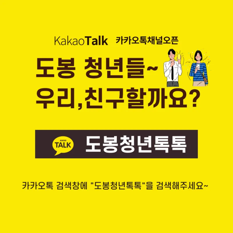 도봉구에서는 모바일 친화적인 청년 맞춤형 정책 홍보와 청년들의 다양한 의견청취를 위하여 도봉구 청년 대상 홍보채널인 「도봉청년톡톡」 카카오톡채널을 개설ㆍ운영하오니, 관심있는 청년들의 많은 이용 바랍니다.
