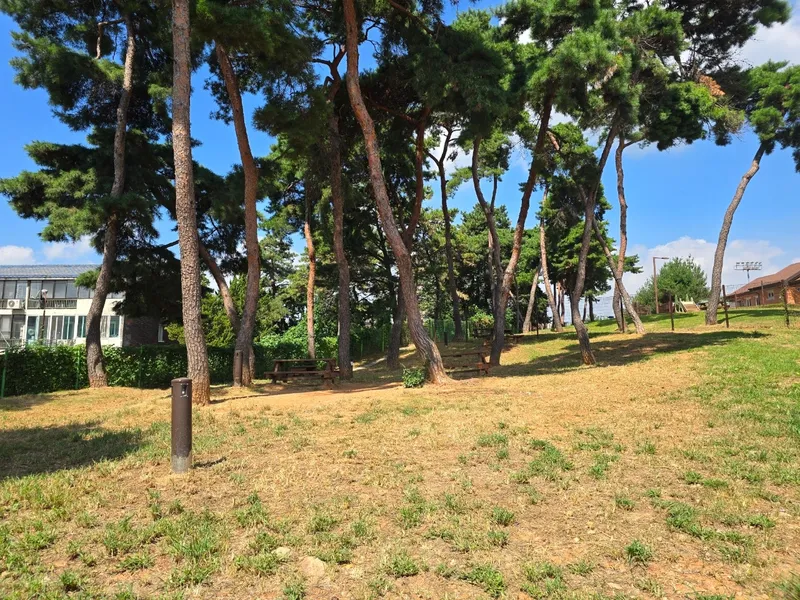 소나무 아래에 잔디와 언덕이 어우러져 있어