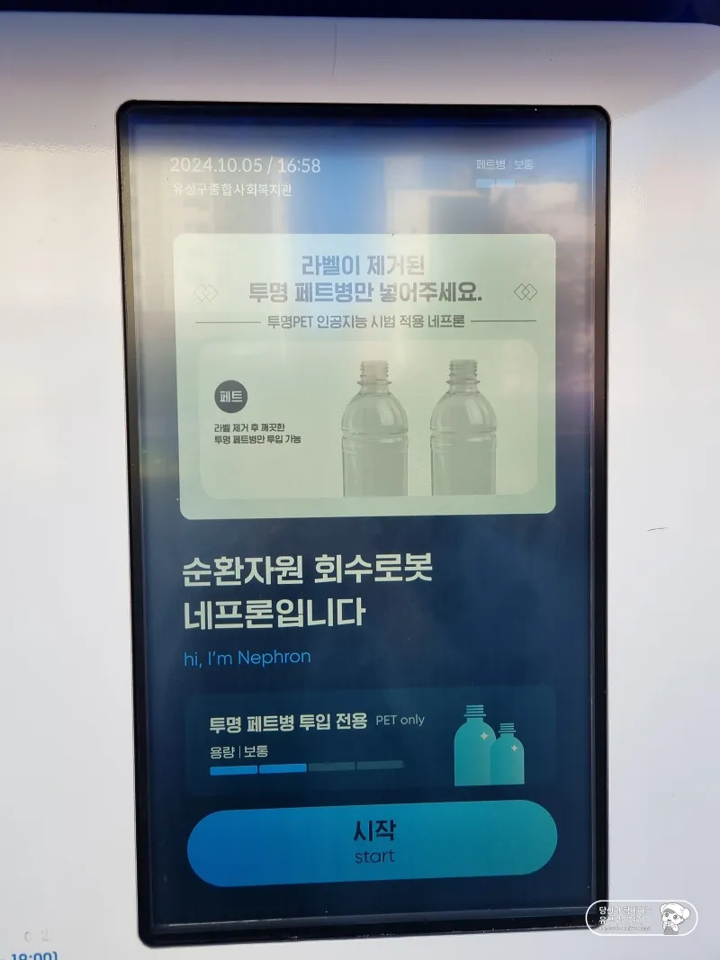 화면에는 현재 순환자원 회수로봇의 용량이 뜨고 아래에 시작 버튼이 있습니다. 시작 버튼을 꾹 눌러줍니다.