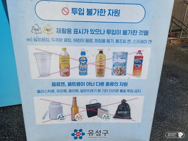 그냥 일회용 컵이나 어린이 음료, 화장품 용기 등의 플라스틱 순환자원 회수로봇에 넣을 수 없다는 점 유의해주세요. 또한 그 외 유리, 캔, 종이, 일반쓰레기 등의 종류는 유성구 종합사회복지관 순환자원 회수로봇에 넣을 수 없습니다.