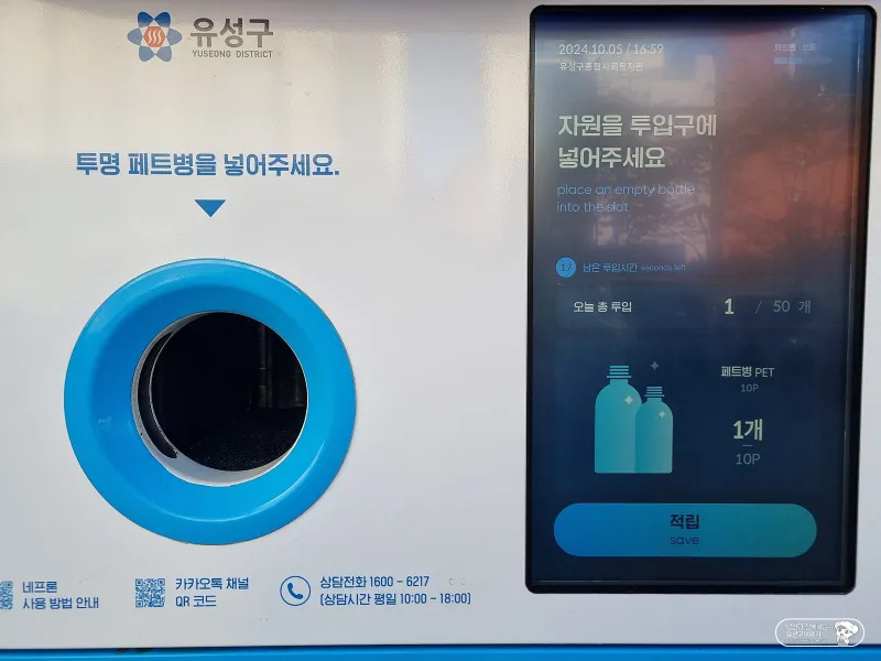 참고로 캔류 순환자원 회수로봇은 관평동 805 재활용 정거장에 있다고 합니다. 플라스틱 페트병은 유성구 종합사회복지관 순환자원 회수로봇을 이용하시고 캔류는 관평동 순환자원 회수로봇을 이용하시면 됩니다.