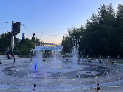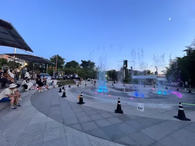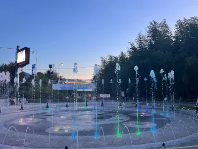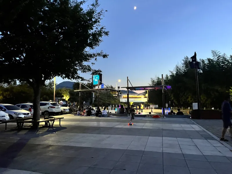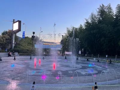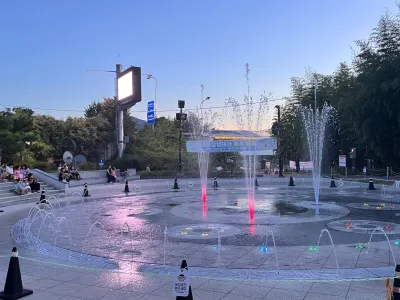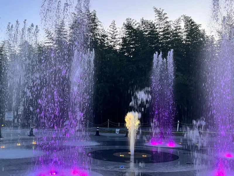 해가 지고 나서 7시 30분쯤 되면 분위기가 확 달라져요. 낮에는 아이들 놀이터였던 바닥분수가 화려한 음악 분수로 변신하거든요.