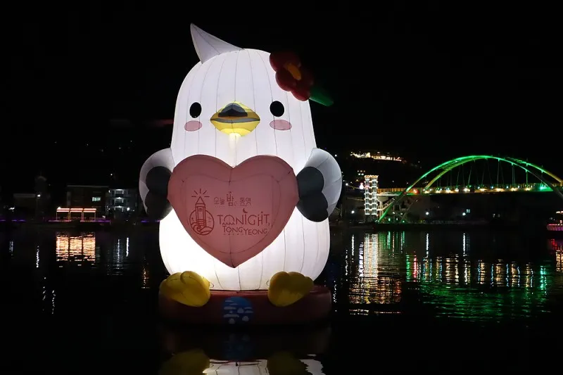 빛의 정원 디피랑의 감동을 마음에 간직하고 내려오니 강구안에 통영의 시조 (市鳥)인 갈매기 동백이가 시화(市花)인 붉은 동백을 꽂고 통영의 밤바다를 밝히고 있습니다. 통영 야경 명소 강구안 일대, 참 아름답습니다. 디피랑의 멋진 풍경 오래오래 기억되는 멋진 풍경이었습니다.