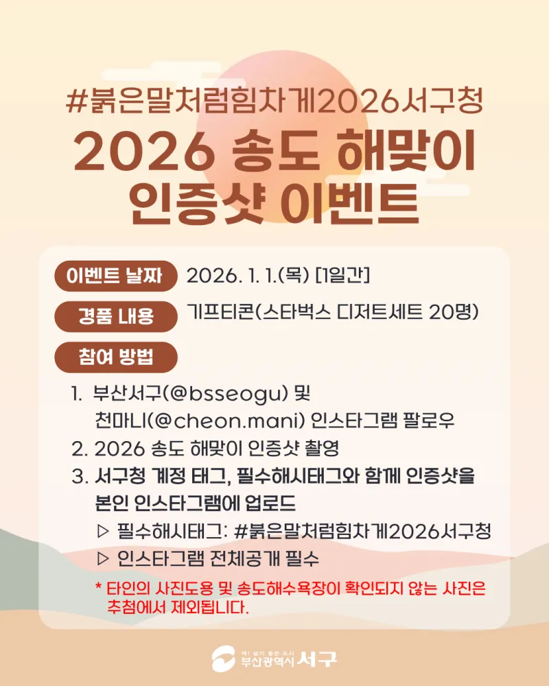 3. 서구청 계정(@bsseogu), 필수해시태그(#붉은말처럼힘차게2026서구청)과 함께 본인 인스타그램에 업로드