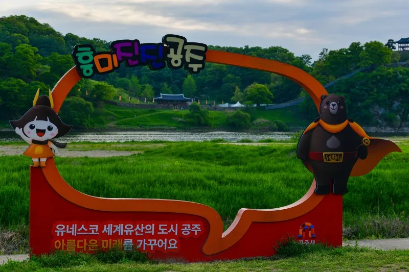 미르섬은 마스코트 고마곰과 공주가 제일먼저 반겨줍니다. 그 뒤로 공산성이 보이는 이 모습이 마음에 드네요.