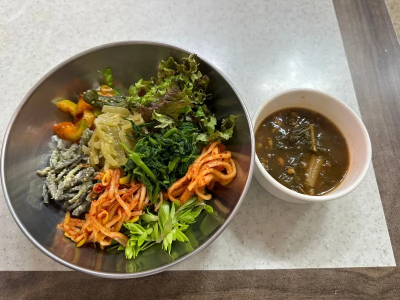 보리밥과 조밥을 반반 넣고 갖은 나물들을 올렸더니 보기만 해도 먹음직스럽더라고요. 밥과 나물을 덜어오는 동안 국을 내주셨어요.