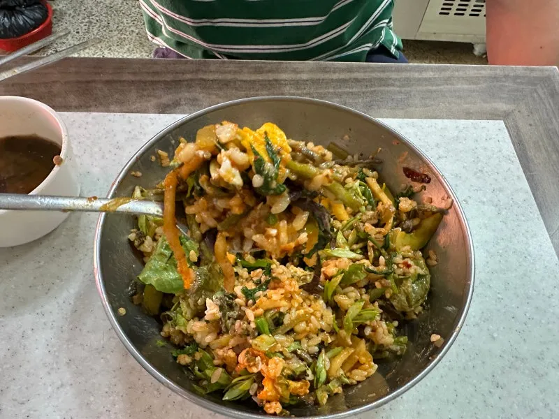 커다란 양푼에 밥과 나물이 가득해서 숟가락 하나로 비비기엔 양이 너무 많습니다.