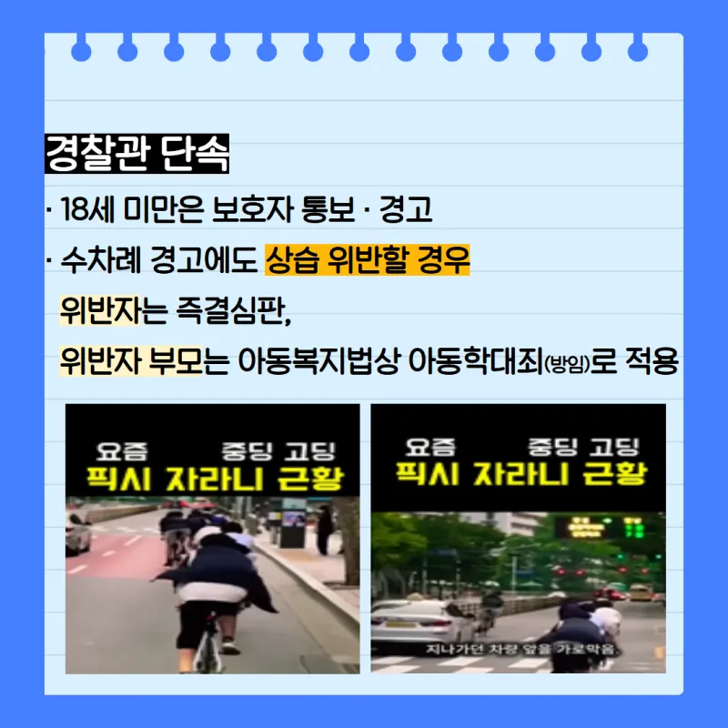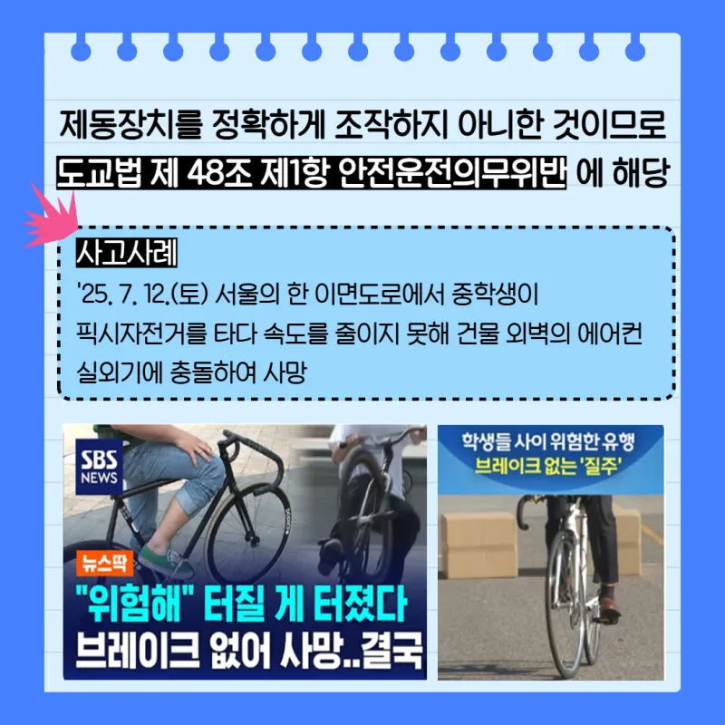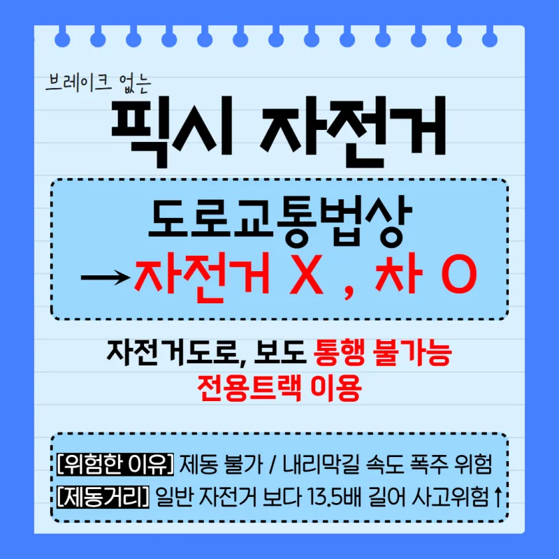 하지만 일반 자전거와 달리 브레이크·변속기가 없어 위험합니다 ⚠️