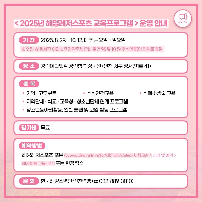 : 한국해양소년단 인천연맹(☎ 032-889-3810)으로 연락 주세요!