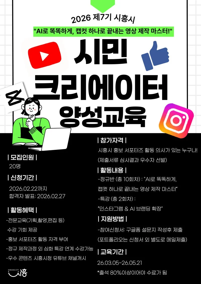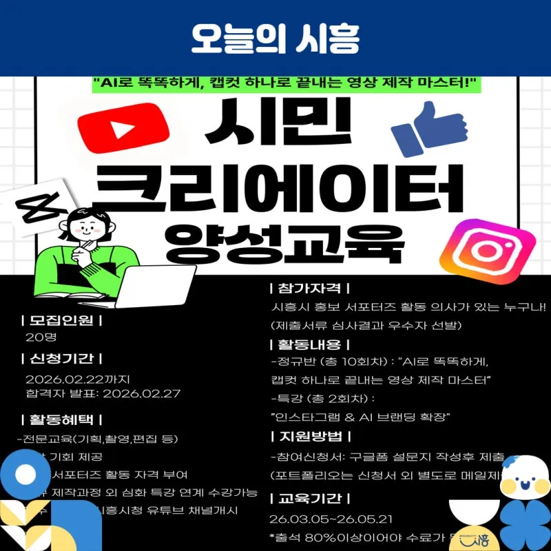 시흥시는 시민 참여형 홍보를 활성화하고 시민이 만드는 콘텐츠를 발굴ㆍ확산하기 위해 ‘2026 제7기 시민 크리에이터(창작자) 양성 교육’을 운영하는 가운데 참가자 20명을 2월 2일부터 22일까지 모집합니다.