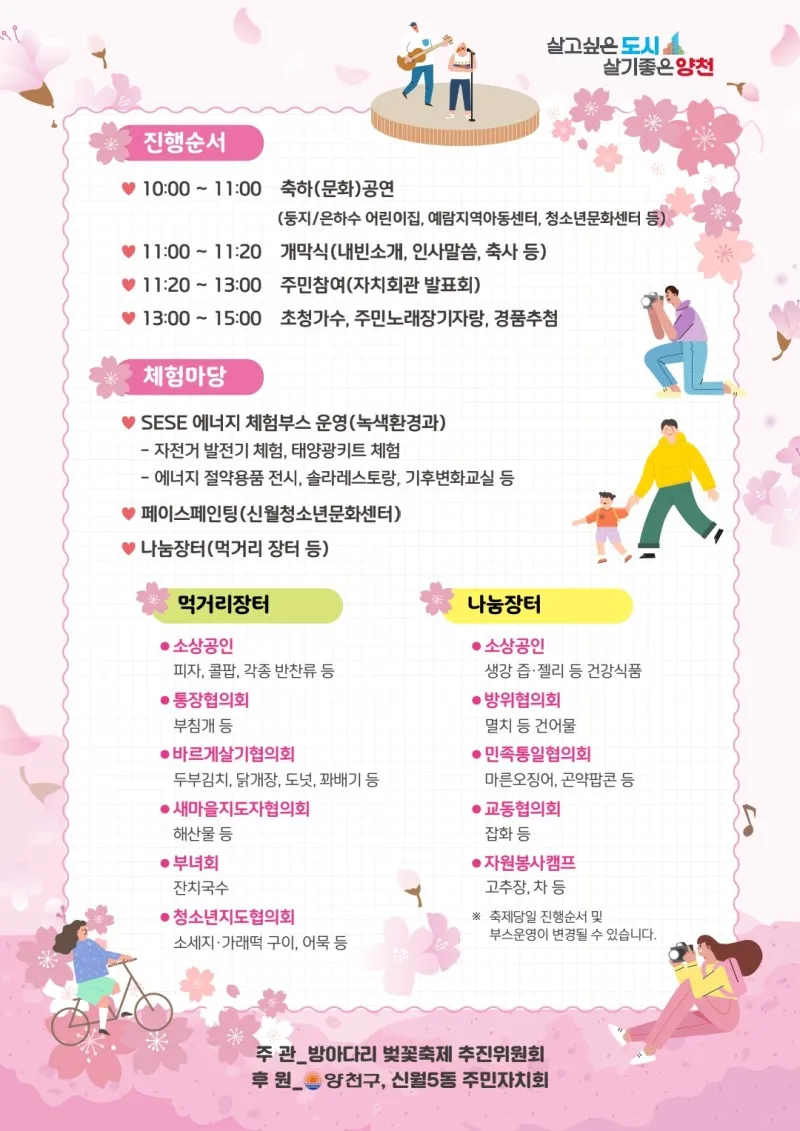 '제13회 방아다리 벚꽃축제'는 벚꽃길을 따라 먹거리장터, 나눔장터, 기후변화 대응 체험부스 등이 마련돼 있는데요! 또한 초대가수, 지역공연팀 등 다양한 공연 무대가 준비돼 있답니다. 온 가족이 함께 방문해 맛있는 음식도 먹고 나눔장터 구경도 하시면 어떨까요?