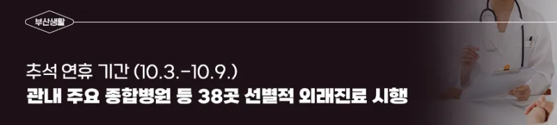 동아대학교병원, 부산대학교병원, 고신대학교복음병원 등은 추석 연휴 전 기간 외래진료를 멈추지만, 응급실은 24시간 열려 시민의 위급 상황에 대비합니다.