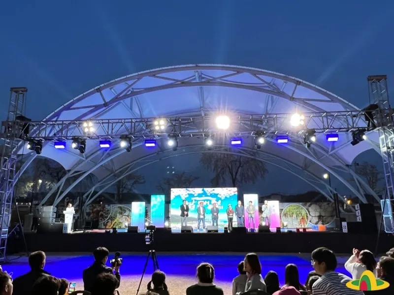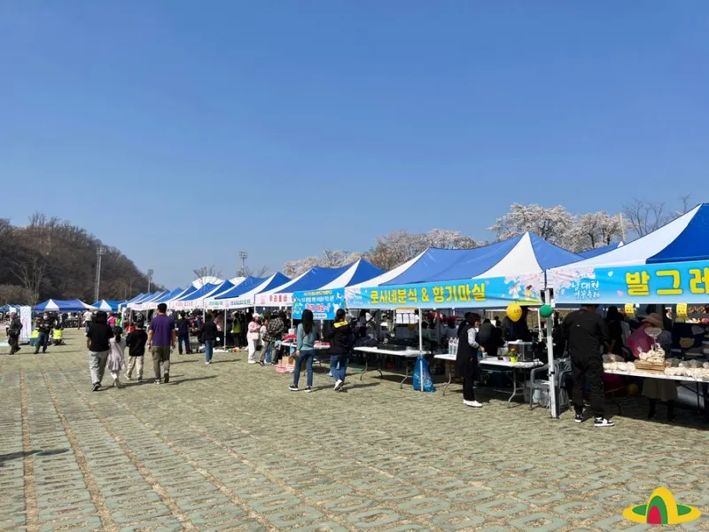 축제의 현장으로 가봅니다. 제법 이른 시간인데도 멀리 천막들이 줄지어 서 있는 게 보입니다. 축제장은 구봉공원 주차장과 공연장에 걸쳐 넓게 마련되어 있습니다. 벚꽃을 구경하고 즐기기엔 안성맞춤인 자리네요.