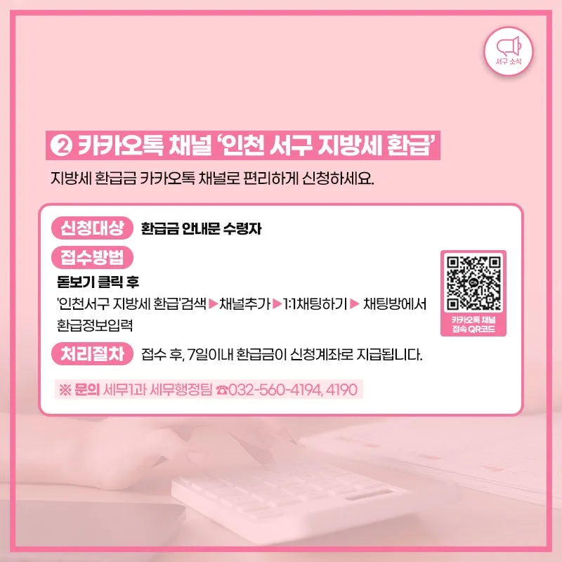 카카오톡으로 환급금 신청 가능 : <인천서구 지방세 환급> 채널