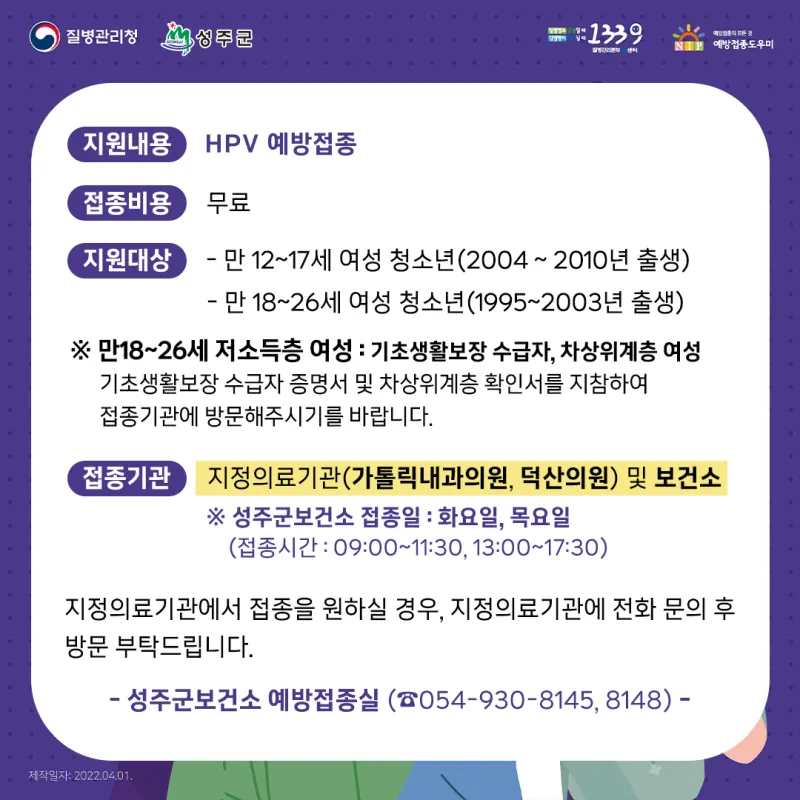 HPV 예방접종 사업 (HPV 예방접종비용 지원) |