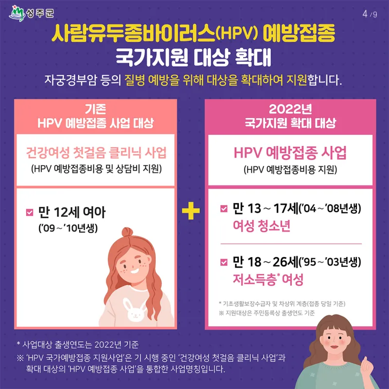 자궁경부암 등의 질병예방을 위해 대상을 확대하여 지원합니다!