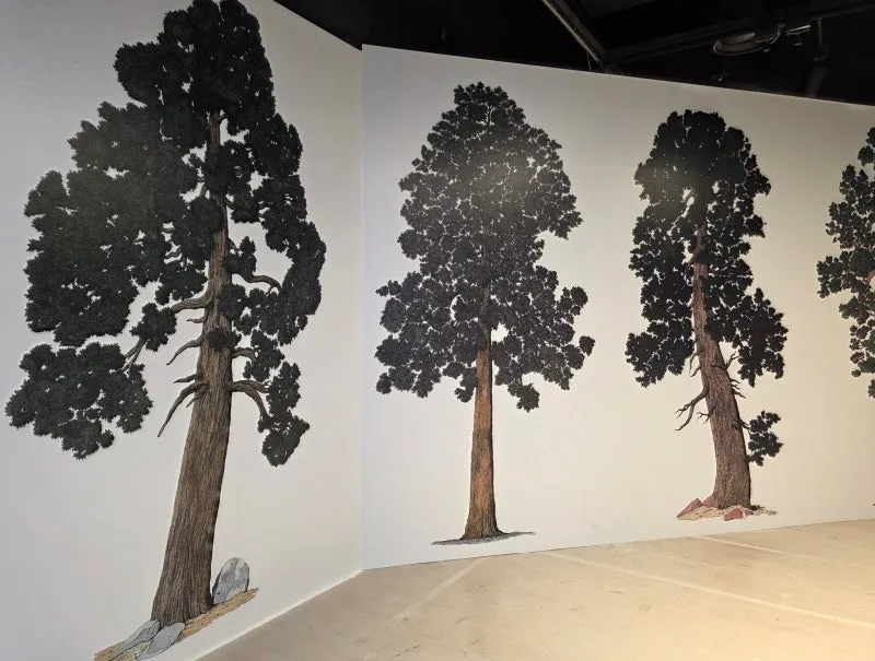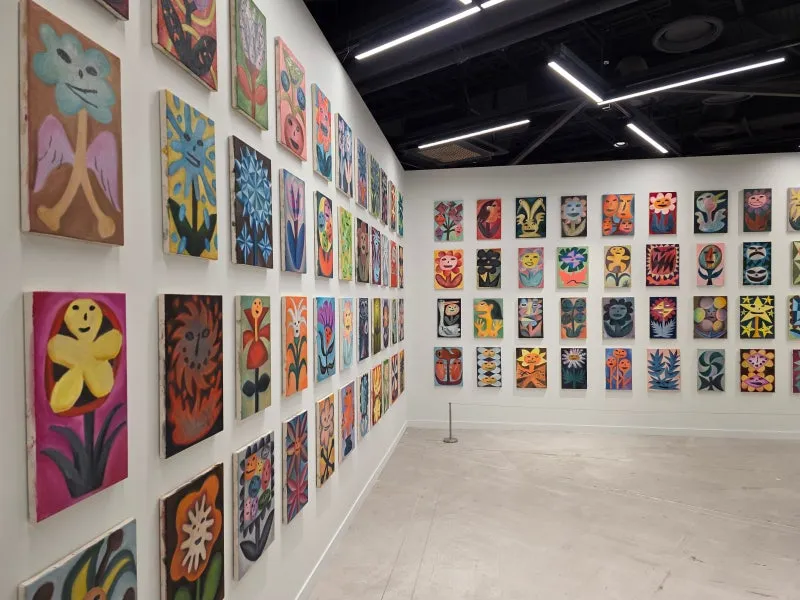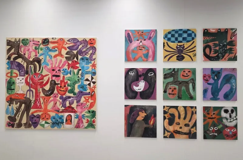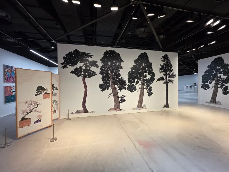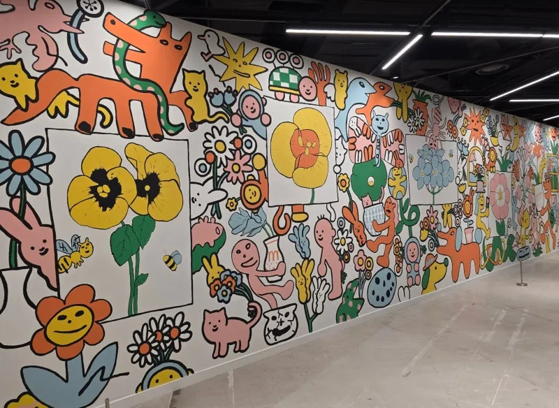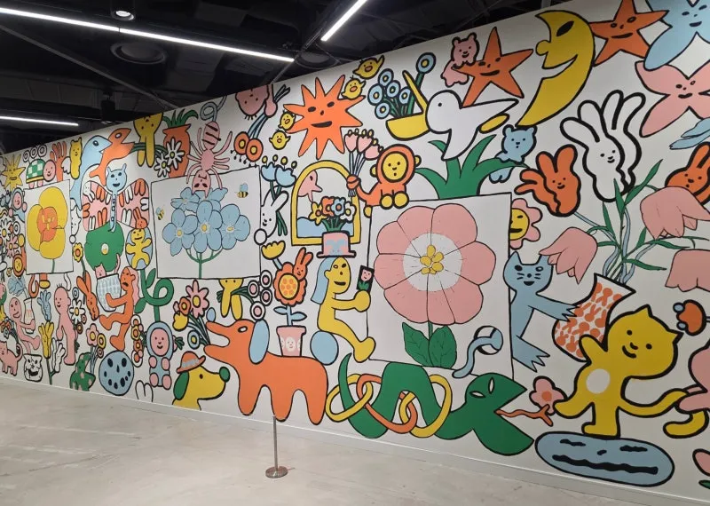 특히, 협업으로 현장에서 완성한 14미터의 대형 벽화는 아티스트 세 명이 서로의 언어와 감각을 겹겹이 쌓아 올리며 즉흥적으로 만들어낸 작품이라고 해요. 세 작가의 색과 선, 그리고 이야기가 한 화면에 교차하며, 각자의 정원이 하나의 거대한 풍경으로 확장되는 순간을 경험할 수 있습니다.