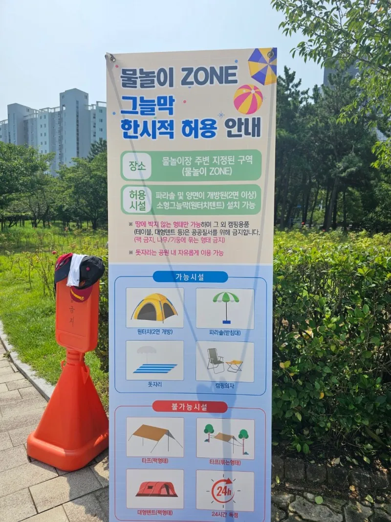 물놀이터 이용기간에만 일시적으로 파라솔 그늘막 앞뒤가 트여있는 2인용 텐트까지는 일시적 사용을 허용합니다.